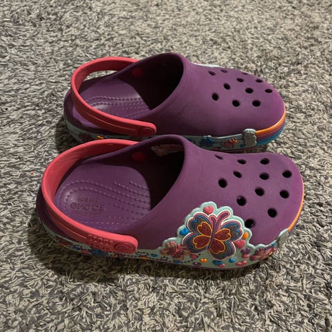 Violetit Crocs kumikengät, ehjät, pohjissa kulumaa.
