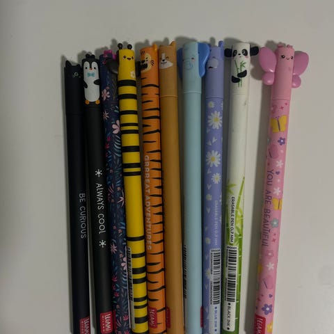 Viisi kappaletta muutaman kerran käytettyä kynää ja kolme uutta