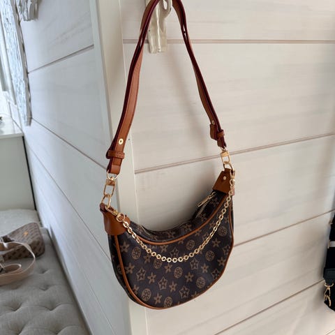 Säädettävä leveä olkahihna sekä koristeellinen kultainen ketju edessä. Vetoketjullinen malli.