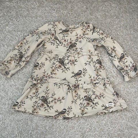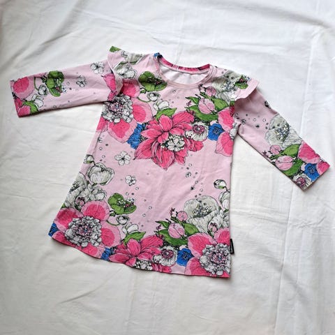 LIVLY mekko tytöille, koko 86/92. Vaaleanpunainen ja valkoinen raidallinen lyhythihainen mekko, jossa on frillamainen helmaosa. Materiaali on puuvillaa. Hyvässä kunnossa.