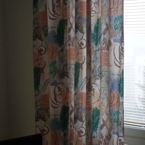 Käytetty kunto, yleisilme siisti. Ovat olleet alunperin lenkkiverhot, lenkit leikattu pois (näkyviin ei jää ripustettuna mitään siitä). Muutama maininta löytyy, mikään näistä ei erottunut käytössä vaan vasta kuvatessa (kts. lisäkuvat):