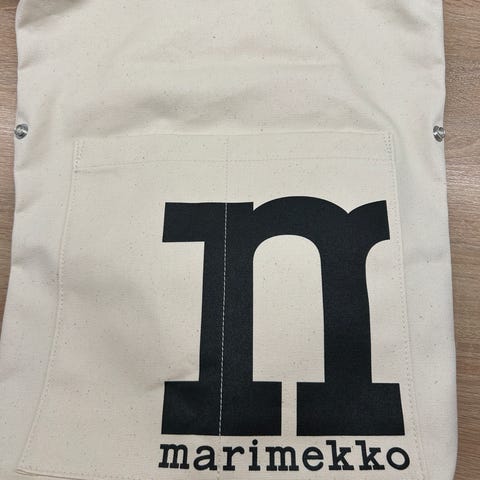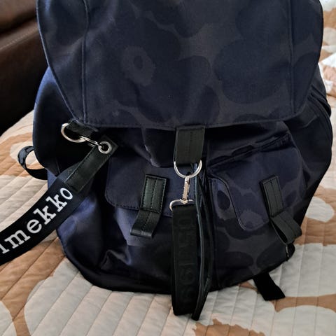 Marimekko reppu unisex-käyttöön. Materiaalina muovi, sävyltään musta tummalla kuviolla. Repussa on läppäkansi ja kiristysnauha pääosassa, edessä kaksi läppätaskua sekä sivussa vetoketjutasku. Takana pehmustettu selkäosa ja säädettävät olkahihnat. Alaosassa näkyy Marimekko-logo. Soveltuu arkeen ja vapaa-aikaan.