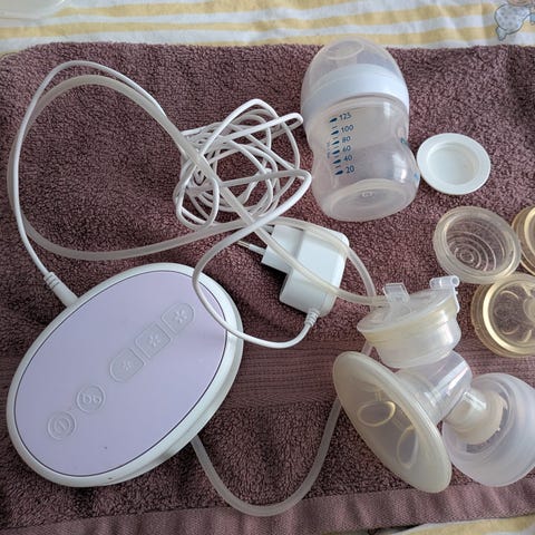 Rintapumppu vain kokeiltu. Osat on pesty tiskikoneessa, silikonituteissa tästä johtuen värjäymää mutta ne voi tietenkin vaihtaa. Pullot Philips avent, twistshake ja Emman pumpun mukana tullut.