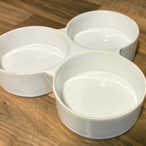 Heirolin kolmiosainen tarjoilusetti. Kolme astiaa puisella alustalla. Kunkin astian koko n. 10,5 x 10,5 cm. Hyväkuntoiset.