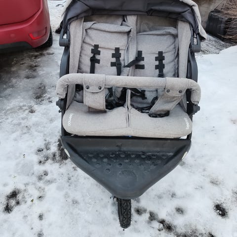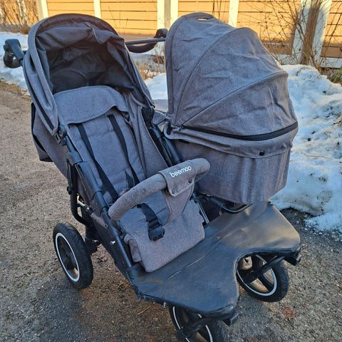 Beemoo tuplarattaat. Rattaissa on vierekkäin sijoitetut istuimet, säädettävät selkänojat, jotka toimivat kyllä, mutta toisessa istuimessa metallikaari on painettava huolellisesti paikalleen, jotta istuin pysyy varmasti ylhäällä (tästä kuva mukana) eli ehkä siinä on jotenkin jousi kulunut tms. Edessä on avattavat turvakaaret (toisessa turvakaaren pehmusteessa reikä, tästä kuva) ja valjaat.