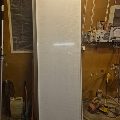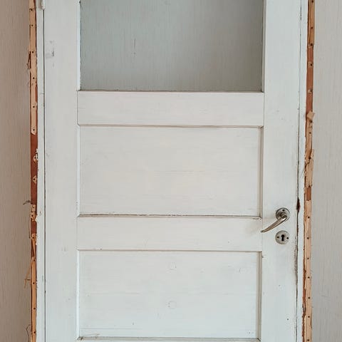 Lasinen terassin ovi alumiinipinta karmissa ja ovi alumiinia. Koko 890×2090×170. Sisäovessa vaurio. Ulko ovi harmaa sisäovi valkoinen kaihtimella, karmi harmaa ulkoa sisältä valkoinen.