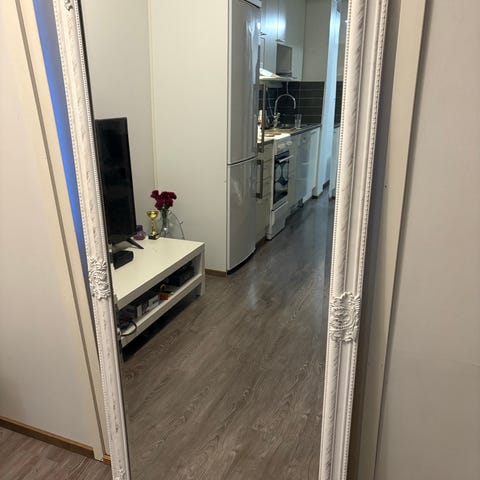 IKEA kokovartalopeili valkoisella kehyksellä. Soveltuu esimerkiksi makuuhuoneeseen tai eteiseen seinään kiinnitettäväksi tai nojaamaan seinää vasten. Peili tarjoaa täyspitkän heijastuksen pukeutumista ja yleistä käyttöä varten. Korkeus 150cm ja leveys 80cm. Haku Oulusta.