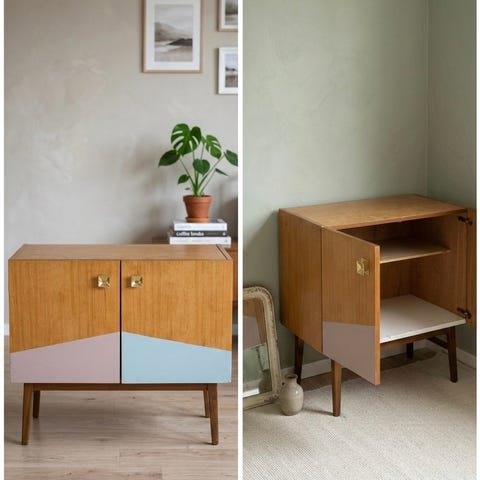 Teak kaappi jossa kirjoitustaso.