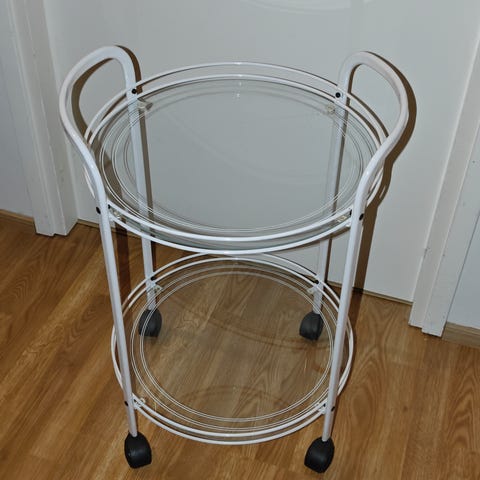 Tyylikäs 60-luvun retro tarjoilukärry myytävänä. Runko kaikin puolin ehjä ja renkaat kunnossa. Päällimmäisessä levyssä ajan tuomaa kuluneisuutta kuten myös rottingissa. Ei hajuja.