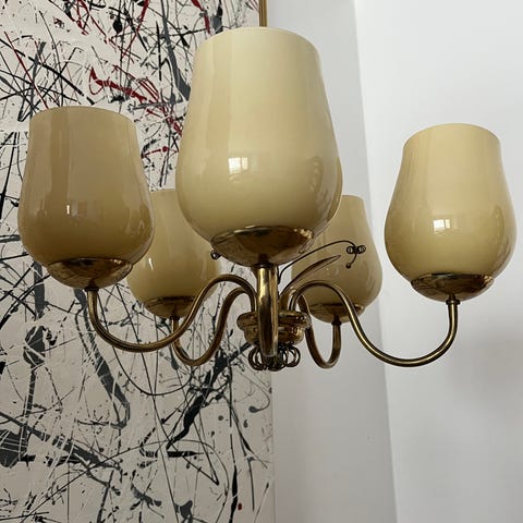 Tyylikäs 60-luvun kattokruunu myytävänä. Kunto hyvä. Lasikuvut ehjät. Toiminta testattu. Halkaisija noin 52 cm ja korkeus 75 cm.