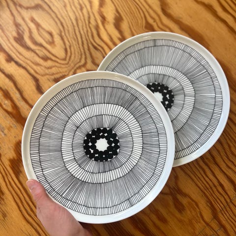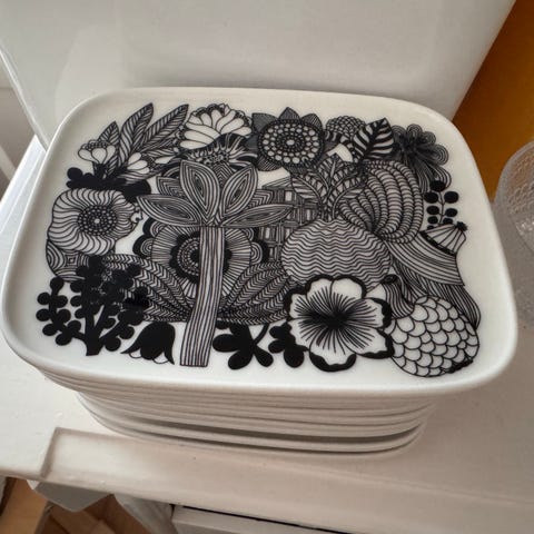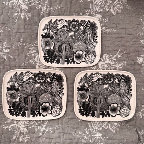 Marimekon siirtolapuutarha ruokalautaset 3 kpl. Mukaan saa halutessaan neljännen, josta on lohjennut pala, muut kolme on ehjiä.