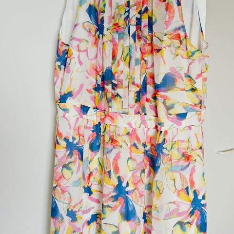 Myydään vain kerran juhlissa pidetty Esprit merkkinen kukkakuvioinen mekko. Mekossa rintataskut sekä lantion alueella taskut. Mekossa napitus ja v-kaula aukko.