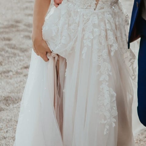 Ihana rembo styling häämekko pitsi-yksityiskohdilla, boho-henkinen.