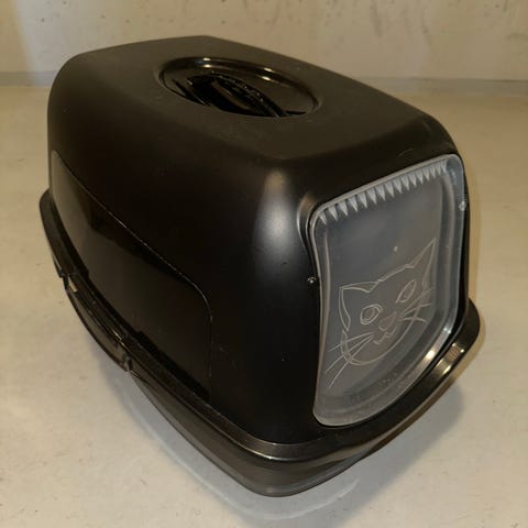 Kissan hiekkalaatikko kulkuluukulla. Laatikko on valmistettu muovista ja siinä on etuluukku, joka auttaa pitämään hajut ja hiekan sisällä. Yläosassa on kantokahva helpompaa siirtelyä varten. Sivuilta löytyy kiinnityslukot, joilla kansi pysyy paikoillaan.