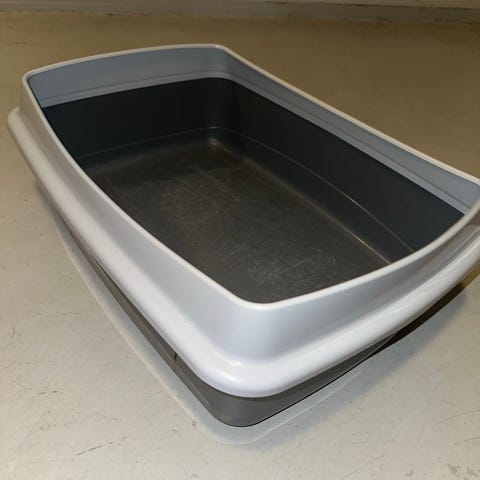 Kissan hiekkalaatikko kannella ja lapio, valko–sini muovi