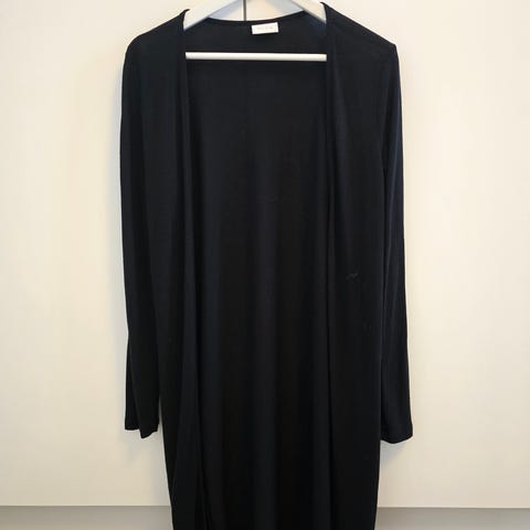 H&M Basic -naisten neuletakki. Koko XS. Väri musta. Materiaali viskoosia. Malli on napitettava, pitkähihainen ja ohutta neulosta. Sopii käytettäväksi esimerkiksi arjessa ja kerrospukeutumisessa.
