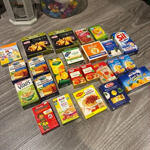 Astioita Leikkeihin. Kattila / Kauha / Vispilä. Lettupannu / Kananmuna. Tarjottimia 2 kpl Muovinen ja Peltinen. Muovikippoja 2 kpl. Kakkuvuokia 2 kpl Muovi 1 kpl Peltinen. Työvälineitä puisia ja muovisia. Kauppaleikkeihin rahoja ja koottavia pahvisia pakkauksia. Nouto.