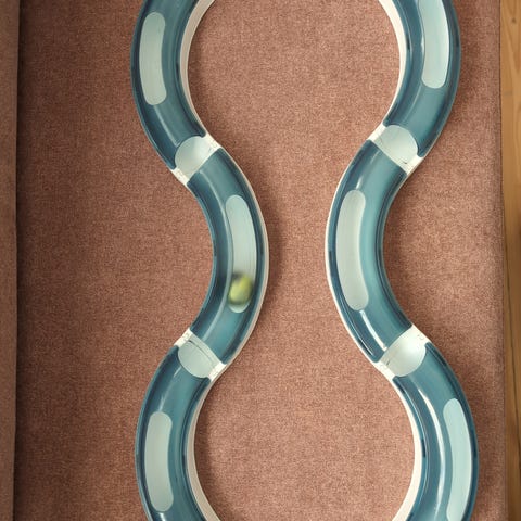 Catit leikkirata kissalle. Sinisävyinen muovinen rata, jossa valkoiset läpinäkyvät osat ja pallo sisällä. Useita irto-osia, joista voi koota erilaisia ratoja, mm. pyöreän ja kaarevia osuuksia. Soveltuu sisäkissojen aktivointiin ja leikkiin.