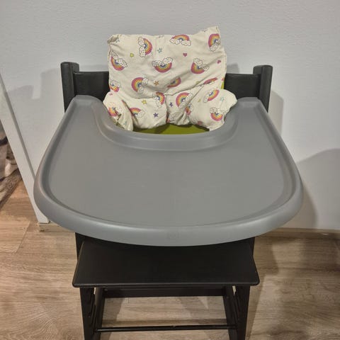 Stokke Tripp Trapp valkoinen tarjotin ja baby set, jossa selkänoja ja turvakaari. Siisti käytetty kunto, tarjottimessa muutamia melko huomaamattomia naarmuja tai jälkiä. Baby set on uudempaa mallia (V3). Nouto Länsi-Herttoniemestä tai sopimuksen mukaan Kalasatamasta/Sompasaaresta.