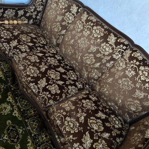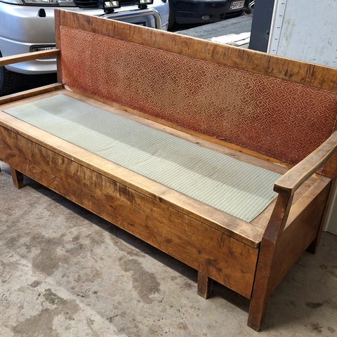 Kaunis vanha laverisohva. Saa levitettyä makuupaikaksi, mutta ei varmastikkaan mukavin nukkumiskäyttöön.