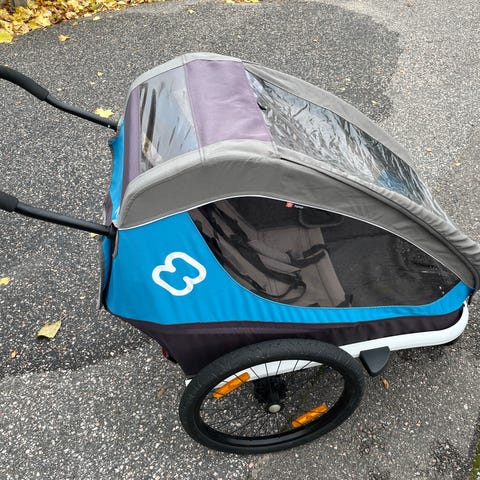 Punamustat kahdenistuttava Burley-pyöräkärry. Pystyy käyttämään rattaita ja polkupyörän vedettävänä. Kärryssä on kaksi istuinpaikkaa turvavöillä sekä vetotanko polkupyörään kiinnittämistä varten. Suojakuomussa on sadesuoja sekä verkkokangasosa. Suuret ilmakumirenkaat takaavat vakaamman kulun. Soveltuu yhden tai kahden lapsen kuljettamiseen pyöräilyn yhteydessä. Kunto on hyvä, mutta kulumaa löytyy. Pohjasta on paikattu pieni reikä liimattavalla nylon-paikalla.