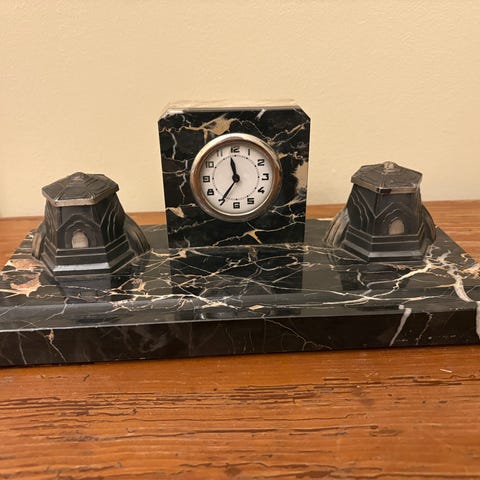 Art Deco marmorinen kynä- ja musteteline, kynttilänjalat, mustepullo ja jokin paino systeemi joka on halki.