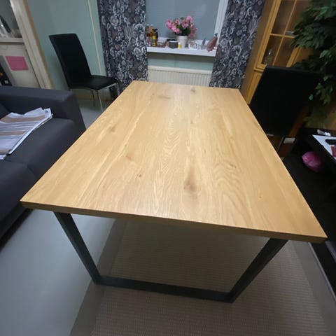 Ruokapöytä, jonka pöytälevy on tammijäljitelmäviilua ja jalat mustaa terästä. L80 x P120 x K75 cm