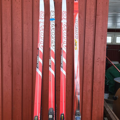 Atomic Supercap perinteisen tyylin sukset siteillä. Suksissa on Salomon profil automat siteet. Väri pääosin sinivalkoinen tehostevärein. Sopivat perinteiseen maastohiihtoon.