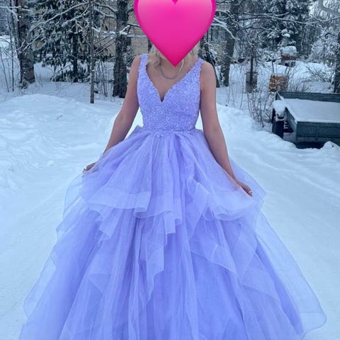 Kaunis, kerman-/samppanjanvärinen keijukaismekko tanssiaisiin. Helmaan valuvana ihania kukkais- ja hopeankimalteisia paljettiyksityiskohtia. 🤍