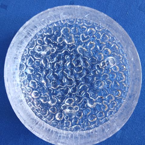 Iittala lasikulho kirkasta lasia. Kulhossa on kohokuvioitu, pisaramainen pintakuvio sekä ulkopuolella pystyraidoitus. Sopii esimerkiksi tarjoiluun, naposteltaville tai sisustuselementiksi. Halkaisija mitattuna noin kuvassa näkyvän mittanauhan mukaan.