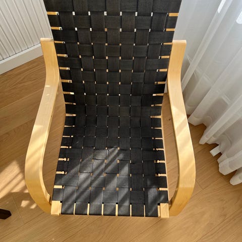 Lakattua koivua, tummanharmaa tekstiiliverhoilu. Leveys 70 cm. Istuinkorkeus 41 cm. Kokonaiskorkeus 95 cm.