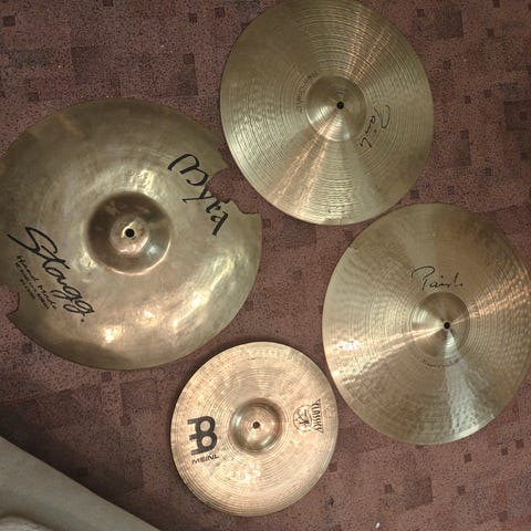 Olis myynnissä siis aloittelijaystävällisiä rumpuja ja peltejä. Kunto on noissa rummuissa ihan kohtuullinen, kalvot on saanut kyytiä, mutta rummut kyllä soi. Virvelistä on matto irti, mutta joku kätevä sen varmaan saa kiinni. Crashin ja Hi-Hatin kunto on paljon parempi. Hi-Hat- ja Virveliständi ei kuulu kauppaan.