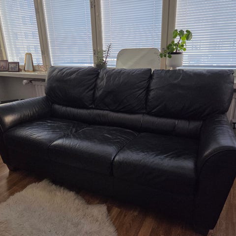 Musta tyylikäs nahkasohva. Kulumaa on. Kaikki tyynyt irrotettavissa. Sivutyynynyt ovat vetotekjuilla kiinni. Kromiset yksityiskohdat.