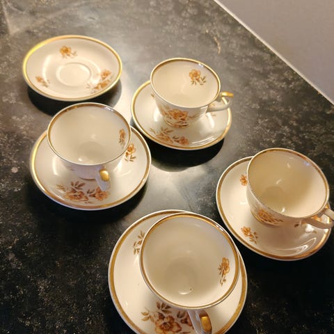 Arabia Myrna kahvikupit ja aluslautaset. Valkoinen posliini, jossa kullattu reunus ja kukkakoristeet. Settiin kuuluu 12 kpl kahvikuppeja ja niille sopivat aluslautaset. Sopii kahvi- ja teehetkiin sekä kattaukseen samaa sarjaa olevien astioiden kanssa.