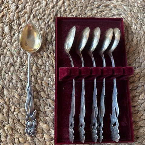 Simpukankuoren muotoinen pesä, ajan patinoima 13 cm pitkä hopealusikka 813H. Ei kaiverruksia.