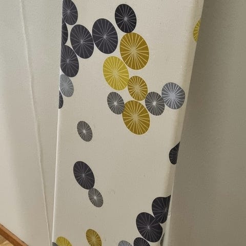 Folding stand-type ironing board in grey color.