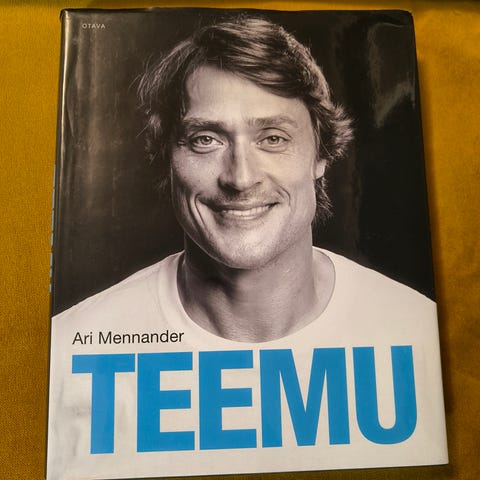 Ari Mennanderin kirjoittama kirja "Teemu". Kovakantinen teos, jossa on mustavalkoinen kansikuva ja sinisellä painettu nimi. Kirja käsittelee Teemu-nimisen jääkiekkoilijan uraa ja elämää, sisältäen tekstiä ja kuvia urheilijan vaiheista ja saavutuksista.