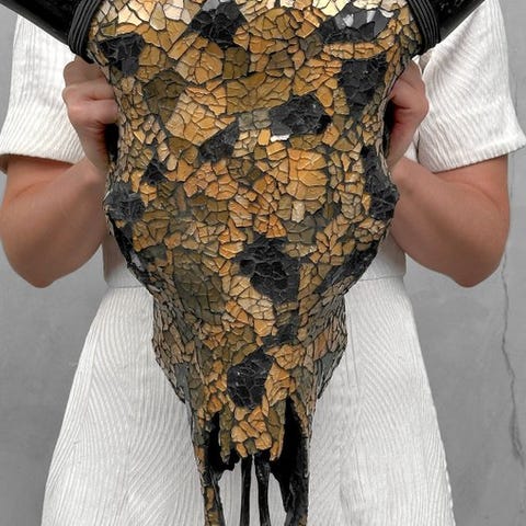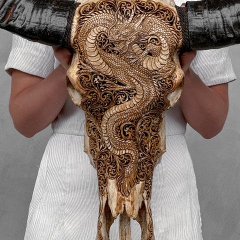 Suuri käsin kaiverrettu härän kallo, kaiverrettu käsityöläisten toimesta, jotka ovat siirtäneet muinaisen kaiverrustaiteen isältä pojalle.Kallo on kokonaan käsin kaiverrettu suurella huolella. Se on epätavallinen, koriste-esine.Kaiverruksena on kaunis saniaislehtikuvio.NOIN MITATKorkeus: 51 cmLeveys: 66 cmVASTUUSANALLINEN HUOMAUTUS- Kallon takana on nyöri, jolla se voidaan kiinnittää seinälle.- Sarvet irrotetaan kuljetusta varten, ja ne on helppo kiinnittää uudelleen. Sarvet pakataan aina laatikon pohjalle kallon alle. Varmistathan, että poistat sarvet ennen pakkausmateriaalin hävittämistä.- Koska kyseessä on luonnollinen kallo, siinä saattaa olla joitakin luonnollisia pieniä halkeamia, rakoja tai hampaita puuttuvia. Tämä on normaalia. Katso kuvat.- Kallomme on puhdistettu ammattilaisittain, mutta hampaissa voi toisinaan esiintyä pieniä värimuutoksia. Tämä on luonnollista ja normaalia, eikä siihen voi vaikuttaa paljoa. Katso kuvat.- Olemme lisänneet joitakin kuvia käsityöläisistämme työssään, jotta saisi käsityksen siitä, miltä kallon kaivertamisen prosessi näyttää.- MAINITTU PAINO SISÄLTÄÄ PAKKAUSMATERIAALIN.LÄHETYS- Tuote lähetetään seurantakoodin kanssa DHL Parcelin, DPD:n tai postNl:n kautta. Seuranta päivitetään Catawiki-lotissasi, kun paketti on jätetty.- Tarkista säännöllisesti, ettei pakettiasi palauteta meille, jolloin ostaja vastaa toisen lähetyksen postikuluista.- Espanjaan ja Portugaliin seurannan osalta käytä tätä linkkiä ja lisää Catawiki-lotin seurantanumerohttps://clientesparcel.dhl.es/LiveTracking/Home- EMME YHDISTÄ TOIMITUKSIA!!!- Jos sinulla on kysyttävää paketistasi, ota meihin yhteyttä Catawiki-viestipalvelun kautta. Yritämme vastata kolmen (3) työpäivän kuluessa.