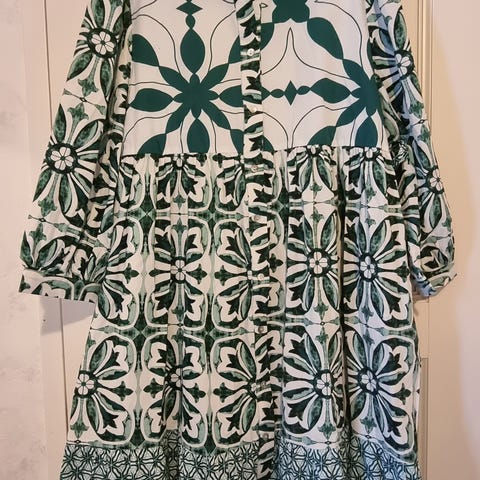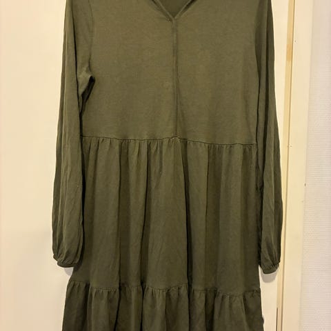 Kiva puuvillamekko mukavan venyvää kangasta. Väri kivan tumman vihreä. Helman pituutta pystyy hieman säätämään edessä olevien nyörien ansiosta. Kaunis nyöritys myös selässä.