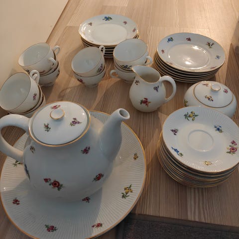 Hakusanat: Paketoitava, Valmistaja, kukkakuvio, leivoslautaset, suomalainen, arabia, keramiikka, posliini, arabian, design kuppi muki kupit lautanen astiasto kahviastiasto tassi asetti lautaset kupit mukit, kultareunus