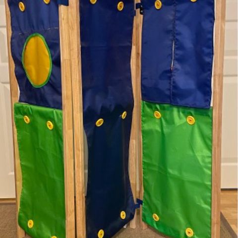 Kaksi kolmen seinän leikkisermiä kankailla. Ikea leikkisermi. Yksi osa on noin 48cm leveä, niitä siis yhteensä kuusi kappaletta. Korkeus noin 124 cm. Sermi on mahtava majan rakentamiseen tai esim teatterin leikkimiseen!