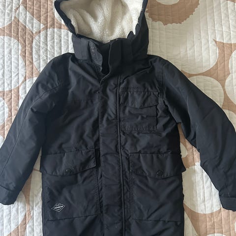 Tummansininen, vedenpitävä takki. Sisäpuolella lämmittävää fleeceä. Erittäin hyvässä kunnossa.