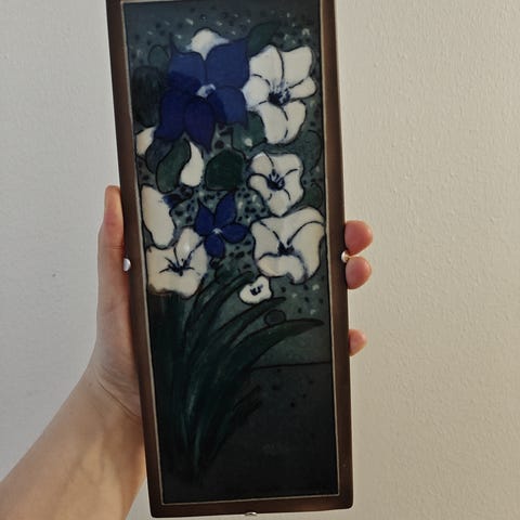 Arabia Suvituuli seinälaatta "Suudelmoiut" vuodelta 1993. Soikea keraaminen laatta, jossa etupuolella värillinen kukka- ja lehtiaihe. Takapuolella teksti, valmistusvuosi ja valmistuserän koko 700 kpl sekä ripustuskiinnikkeet seinälle ripustamista varten. Järkevät tarjoukset!