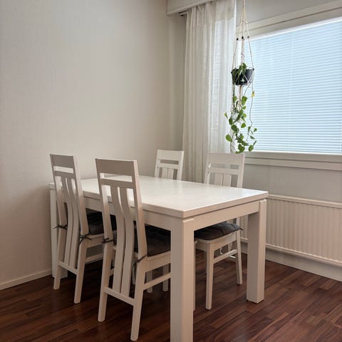 Ok kunnossa oleva ruokailuryhmä käytön jälkeä löytyy pientä kulumaa on 6 tuolia tulee pöydän mukana