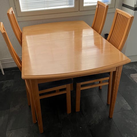 Myydään 7 puista tuolia ja yksi ruskea pöytä (80 cm x 180 cm). Sijaitsevat Riihimäkissa.