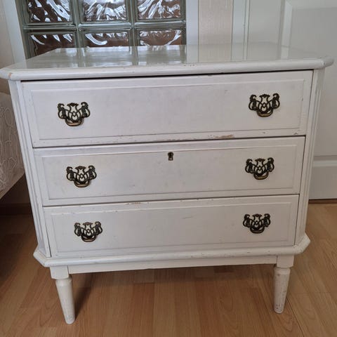 Siisti lipasto seuraavalle. Laatikoiden etupinnassa vähän epätasaisuutta. Yksi laatikon kahva hävinnyt.