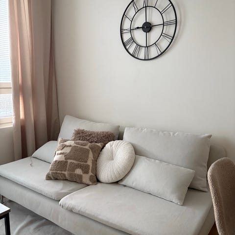 Myydään käyttämätön söderhamn käsinoja fridtuna vaalea beige kankaalla.