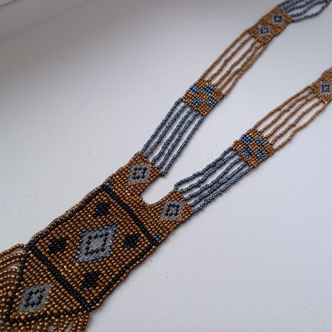 Pitkä rinnalle ulottuva kaulakoru, materiaalista ei tietoa