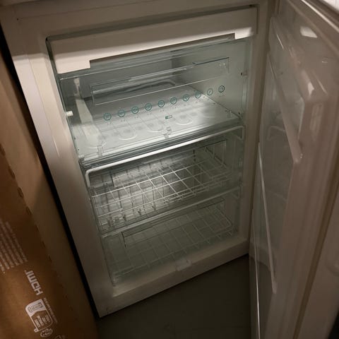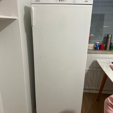 Myydään Candy-merkin pakastin. Vapaasti sijoitettava pystymallinen pakastin, jossa etupuolella pystysuuntainen ovenkahva. Leveys 55cm, korkeus 84cm ja syvyys 57cm.