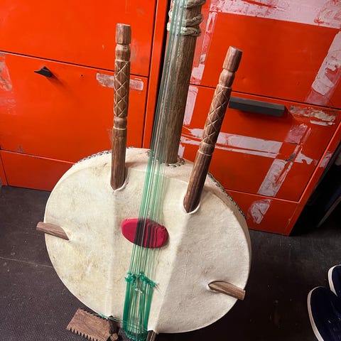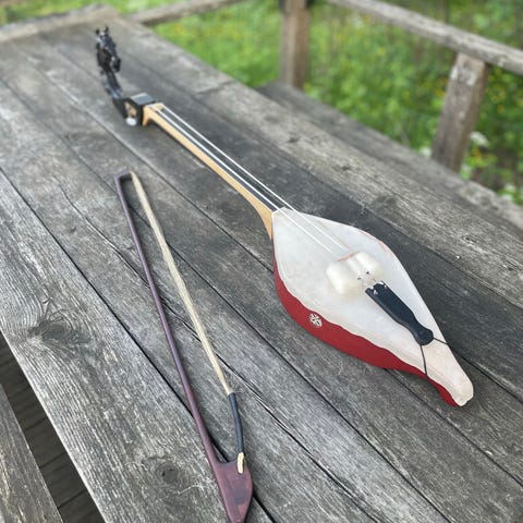 Jousisoitin, jossa on pyöreä, nahkakalvolla päällystetty kaikukoppa ja puinen kaula. Soittimessa on jousi, joka on kiinnitetty rungon päihin, sekä kieli tai kielet, jotka kulkevat kaulan ja kaikukopan yli. Materiaalina on pääasiassa puu ja nahka, väreinä luonnonpuun sävyt, punaruskea ja musta. Sopii esimerkiksi etnisen tai kansanmusiikkisoittimen kokoelmaan tai koriste-esineeksi musiikkiaiheiseen sisustukseen.